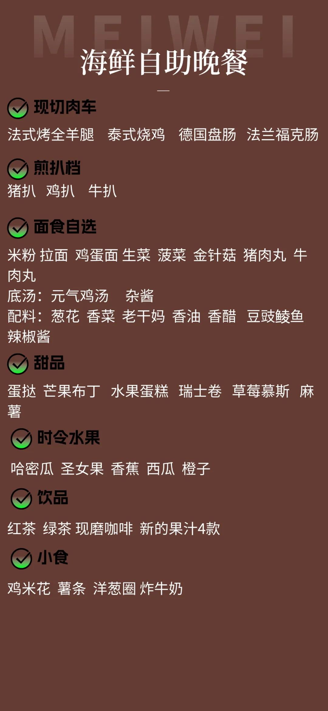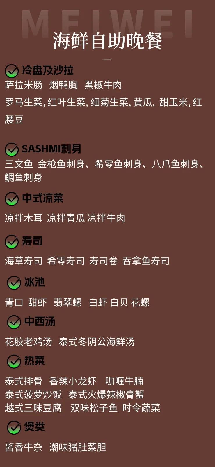 温馨提示:为保障食材新鲜,自助晚餐部分出品可能会有调整,具体以酒店当天现场出品为准
