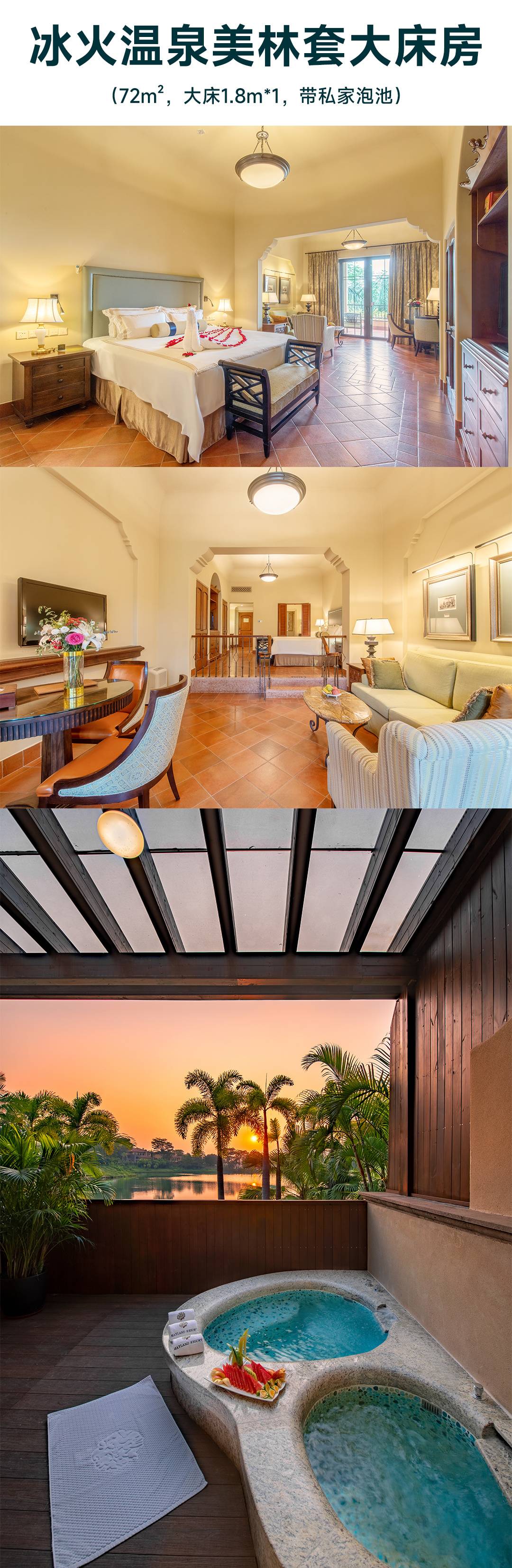 户外温泉区:约两万平方米的自然园林,充分结合原地形设计,拥有活力泉,原汤泉,特色汤泉,私人汤屋,休闲观景区和草坪活动区等由动到静的六大主题部分,30余个原汤池和芳香SPA泡池及无边界泳池。