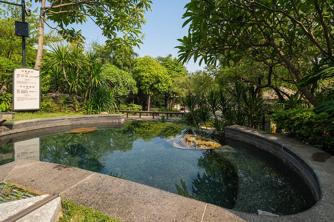 户外温泉区,温泉水源自地下2808米,直接出水温度高达60℃,属苏打型温泉水,泡完之后皮肤滑润细腻,俗称“美人汤”。