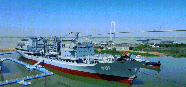 881洪泽湖补给舰是我国自主设计建造的第一代综合补给舰,1979年9月6日下水,1980年列编服役,航迹遍布五大洲、三大洋,26个国家的29个港口,总航程33万余海里,先后执行重大战训任务千余次,创下我舰艇编队“首次环球航行”、“首次通过巴拿马运河”等16项纪录,被誉为“中华补给第一舰”。