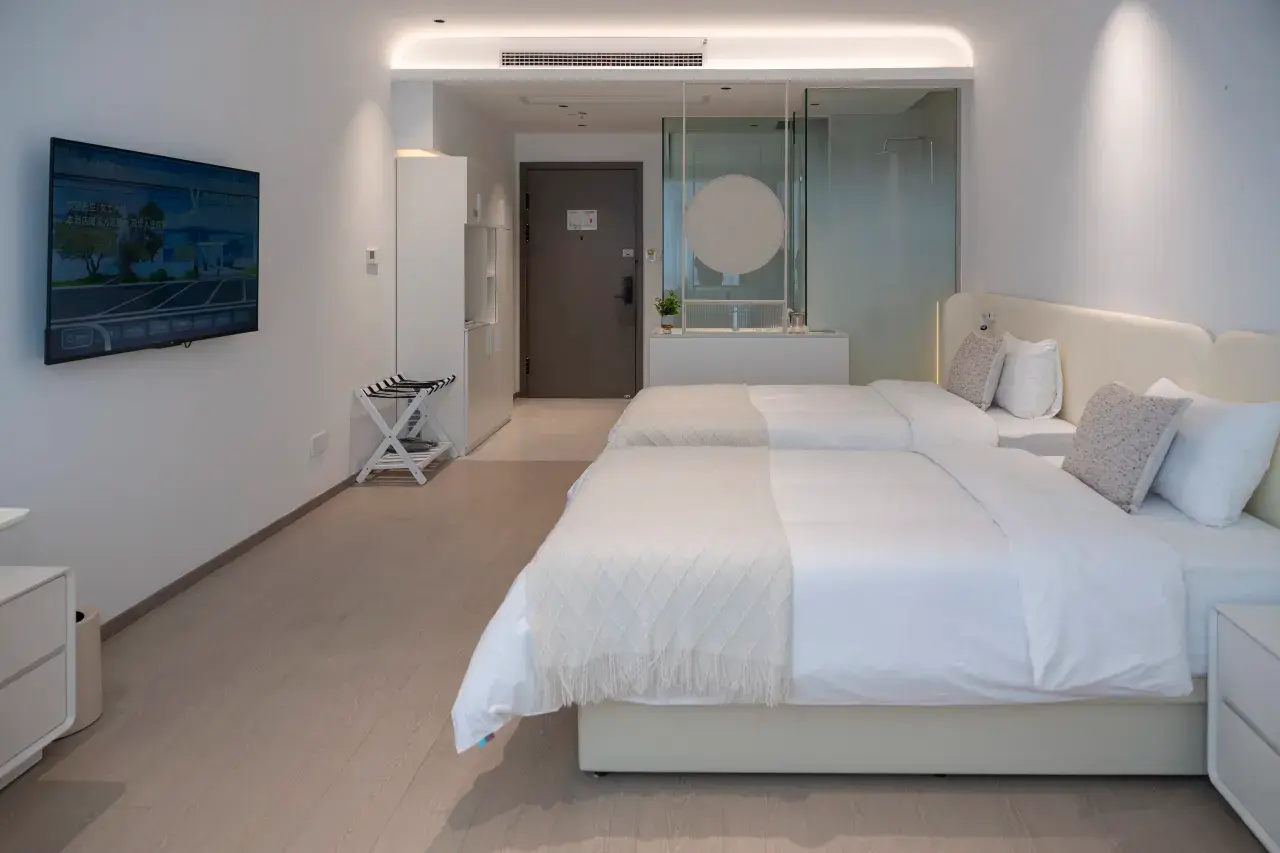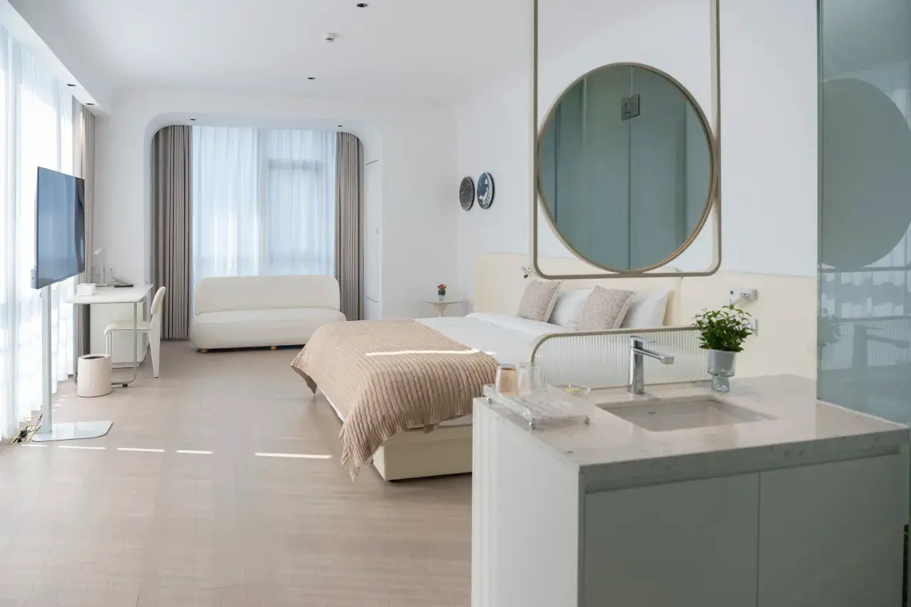 客房设计以白色为主色调,搭配浅木色地板、浅棕床品 ,营造出清新、柔和氛围,视觉上开阔明亮。家具造型简约,线条流畅,如白色沙发、简洁床铺,无过多装饰,营造浓浓的奶油ins风。
