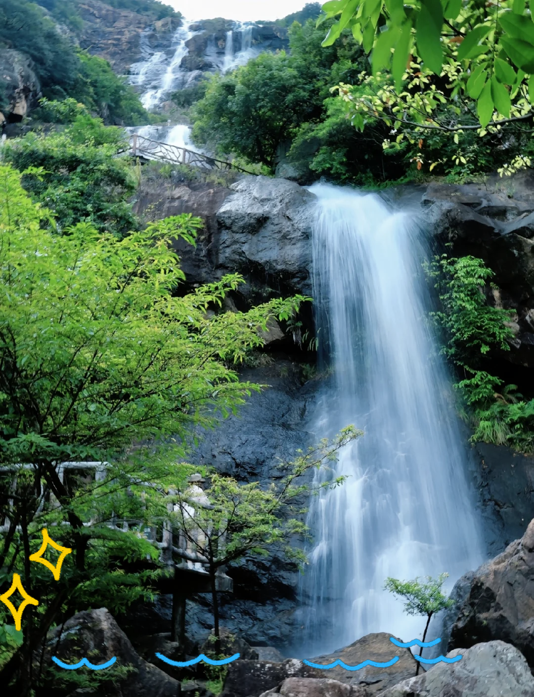 沿着指示牌前行,不久便来到了瀑布的入口。只见一道银色的水帘从山崖上倾泻而下,形成了一道壮观的瀑布。