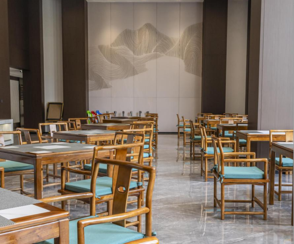 中式风格设计,实木桌椅,同时可容纳近百人就餐。