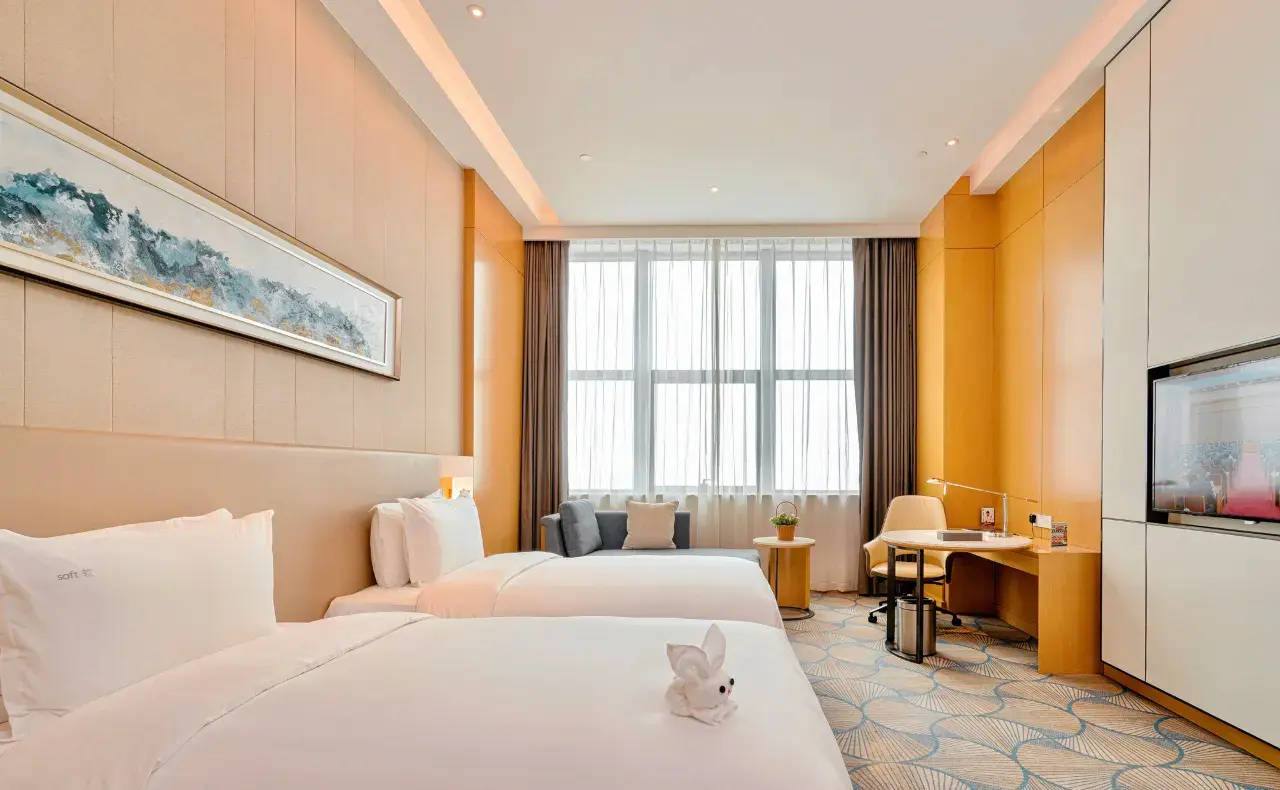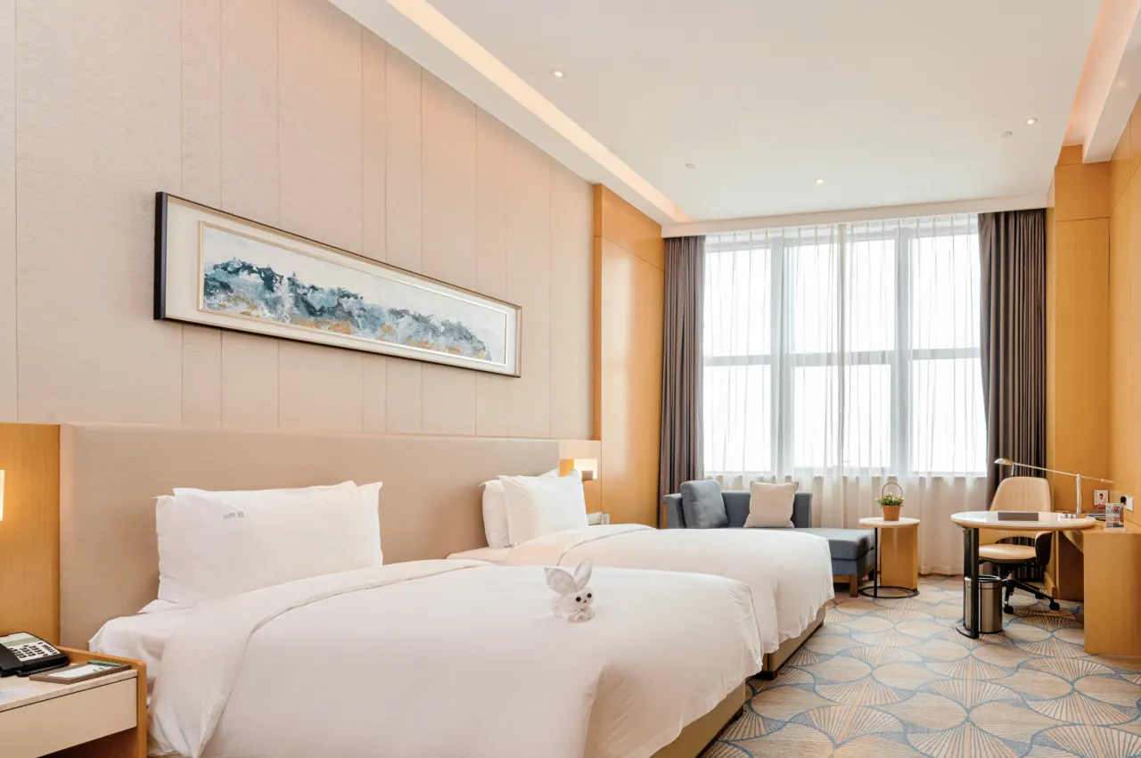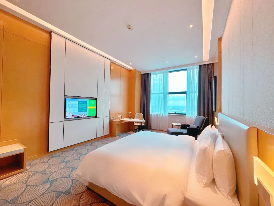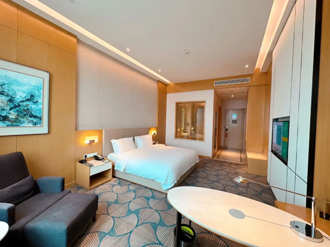 280间客房,位于酒店5-17楼,配套全景窗,风景超赞。本次套餐入住的房型是35㎡豪华大床/双床房,整体空间宽敞,房内时尚简约的装修风格,尽显假日高端品质,非常适合带娃来度假。