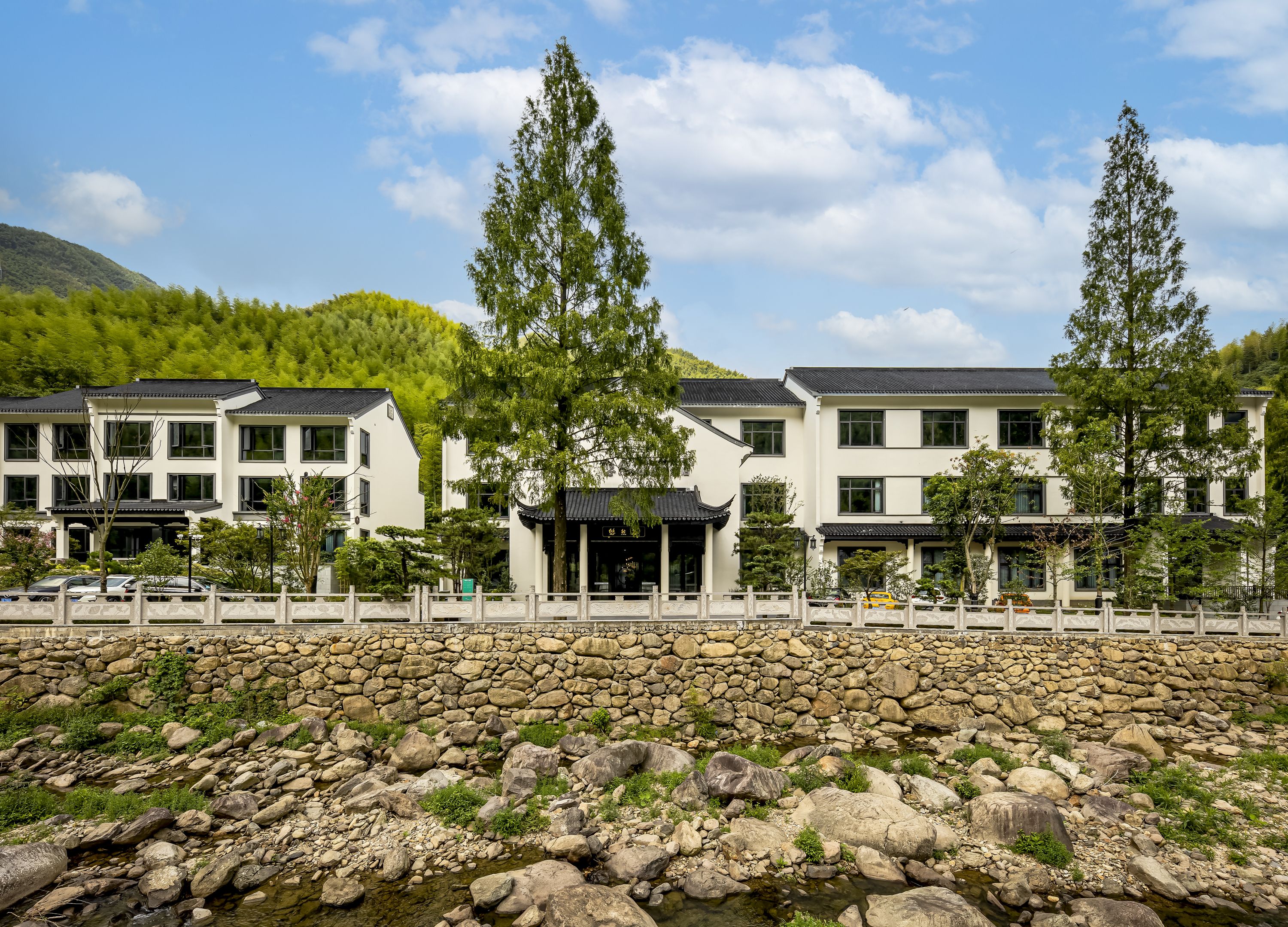 坐落于安吉县报福镇统里村石马湾水库上游,沿河而建,占地叁拾叁亩,总建筑面积约七千八百平方米。