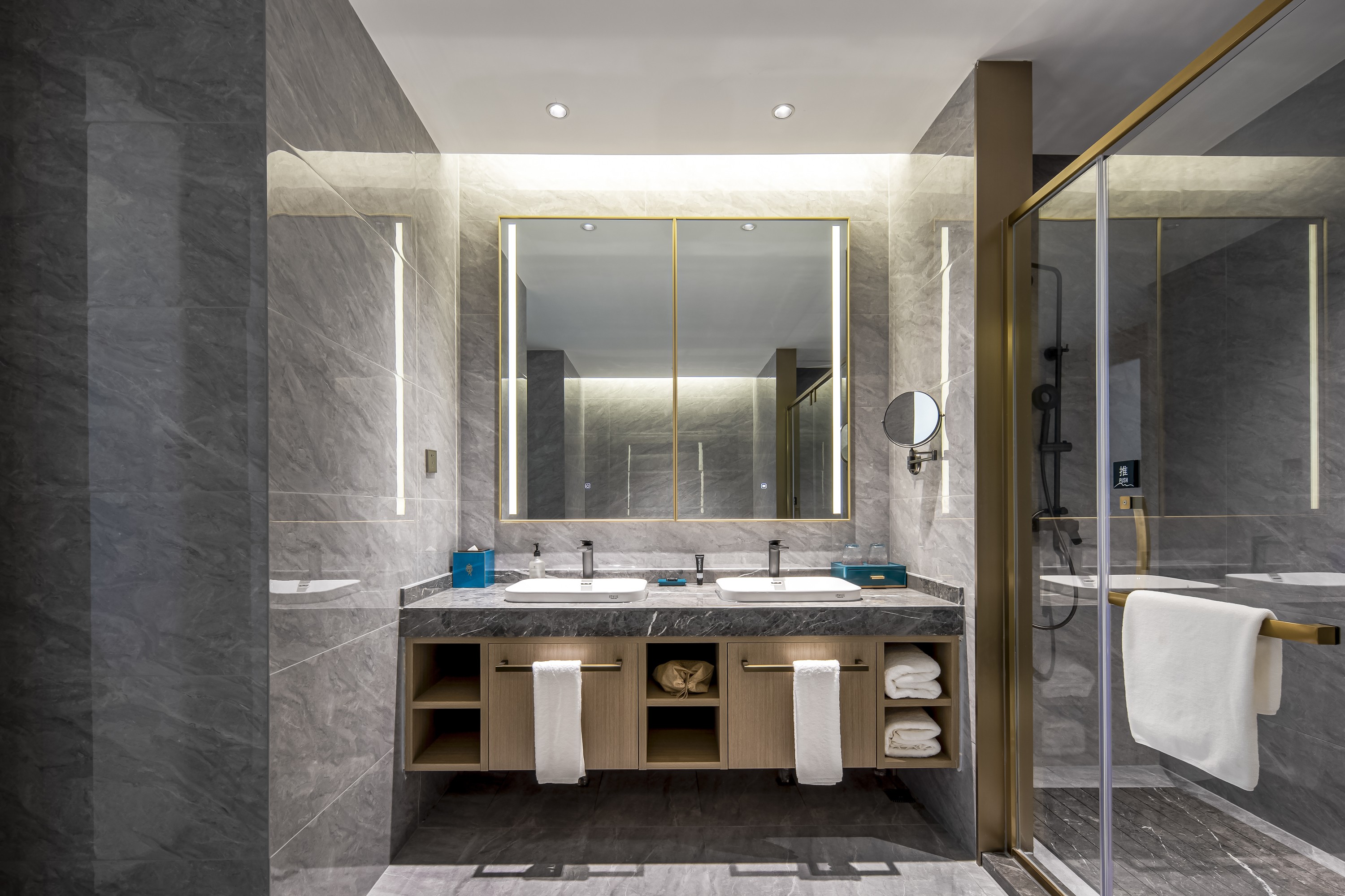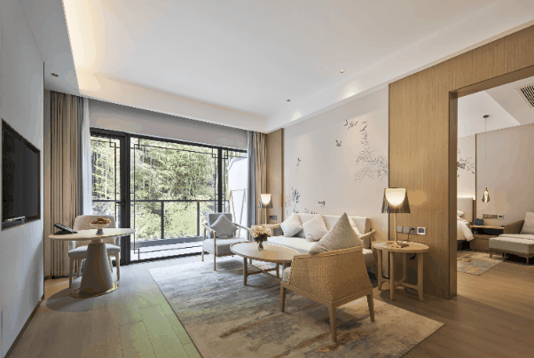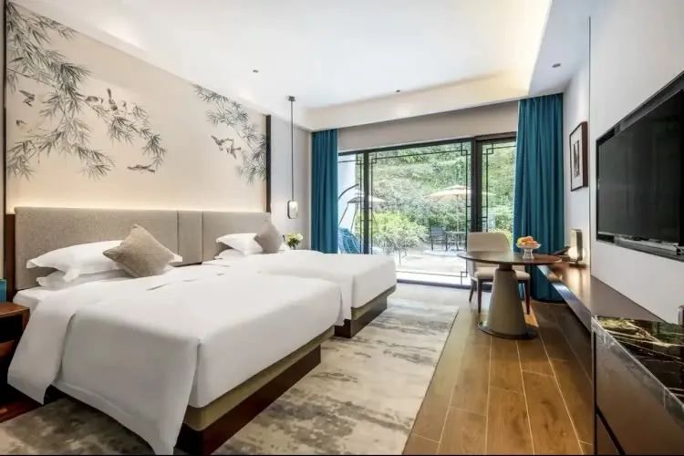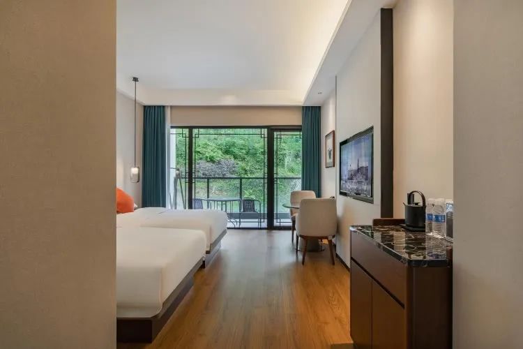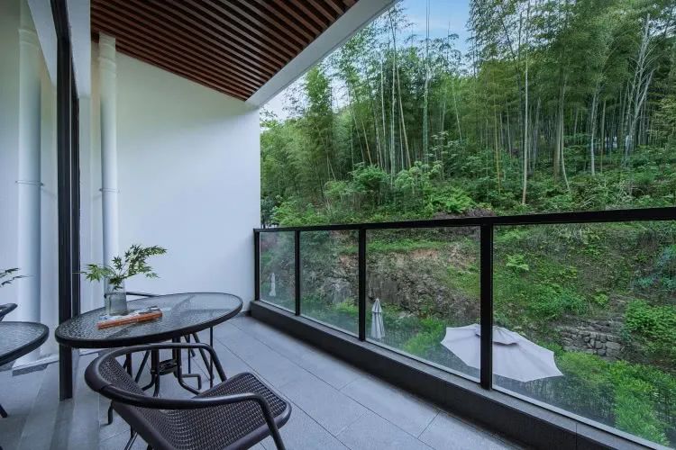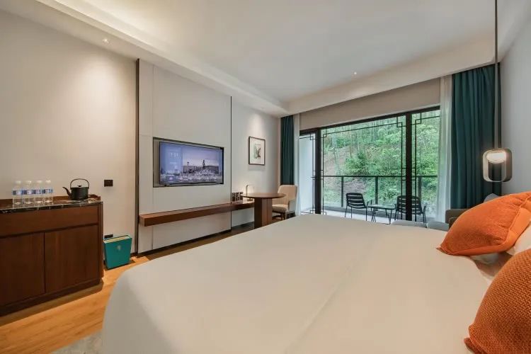 酒店有宽敞的客房和别墅,拥有绝佳私密性和醉人景致,客房区位于一座现代徽派建筑内,包含了山、水、园景房,配有观山面水的露台与庭院。