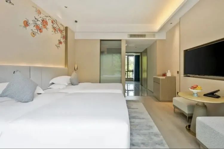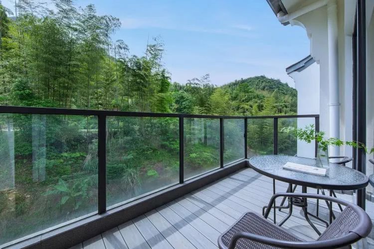 酒店有宽敞的客房和别墅,拥有绝佳私密性和醉人景致,客房区位于一座现代徽派建筑内,包含了山、水、园景房,配有观山面水的露台与庭院。