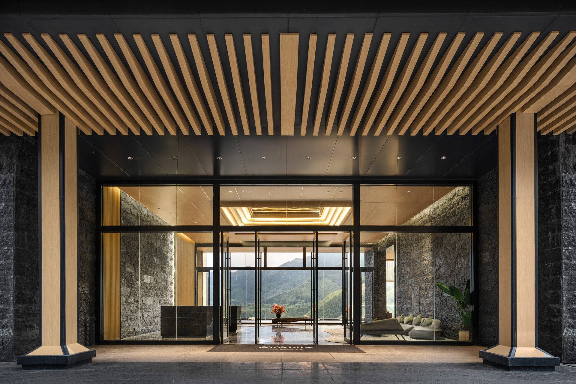 主体建筑采用本土红砂岩与钢化玻璃组合,