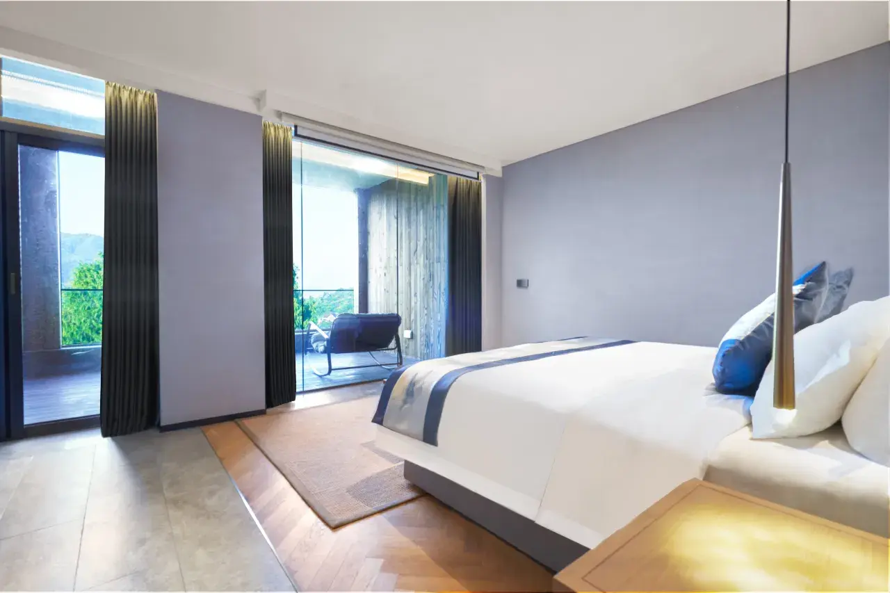 酒店占地约1500亩,百余幢独栋别墅环湖而建,私享千亩田园。一房一景,直面山川湖海,四周景致尽收眼底,让人一整个爱住!