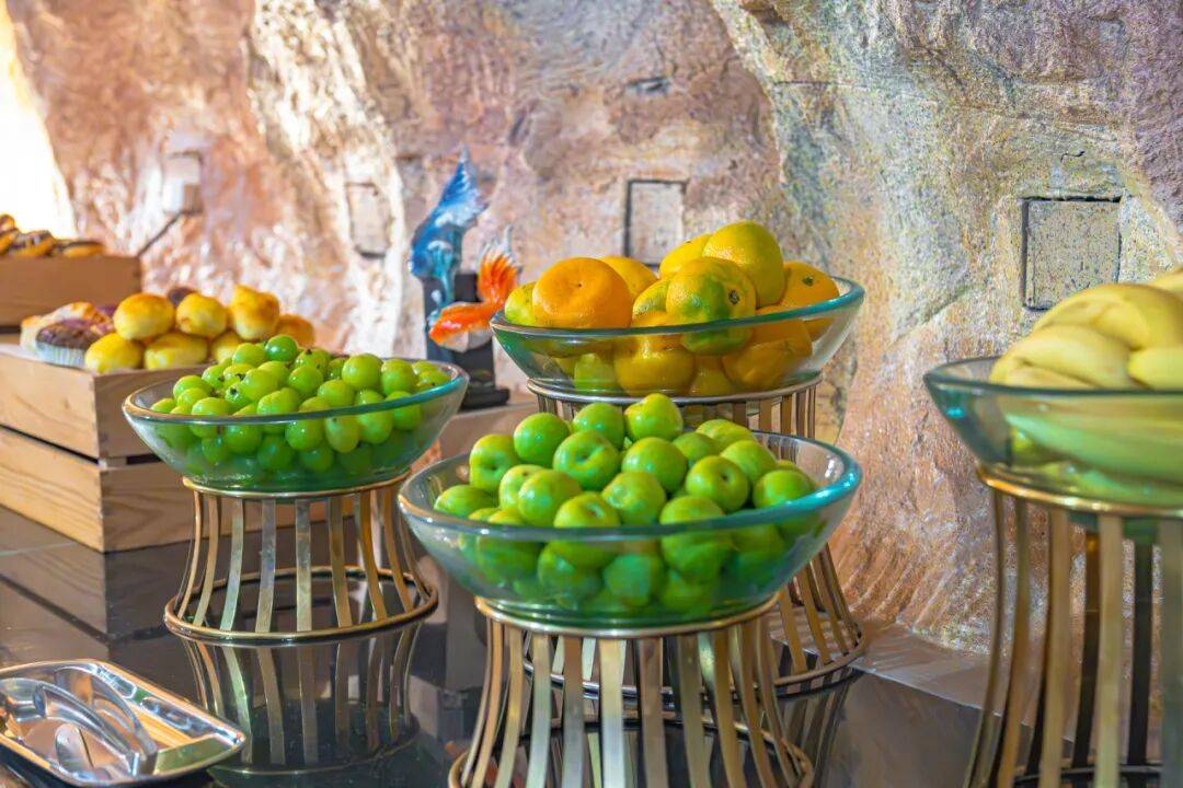 酒店拥有两间餐厅,日月西餐厅正对白玉桥花果山,在这里可以享用营养美味的早、晚自助餐,从寰球美食到地方特色,照顾到不同口味需求。本次套餐享双人自助早餐。