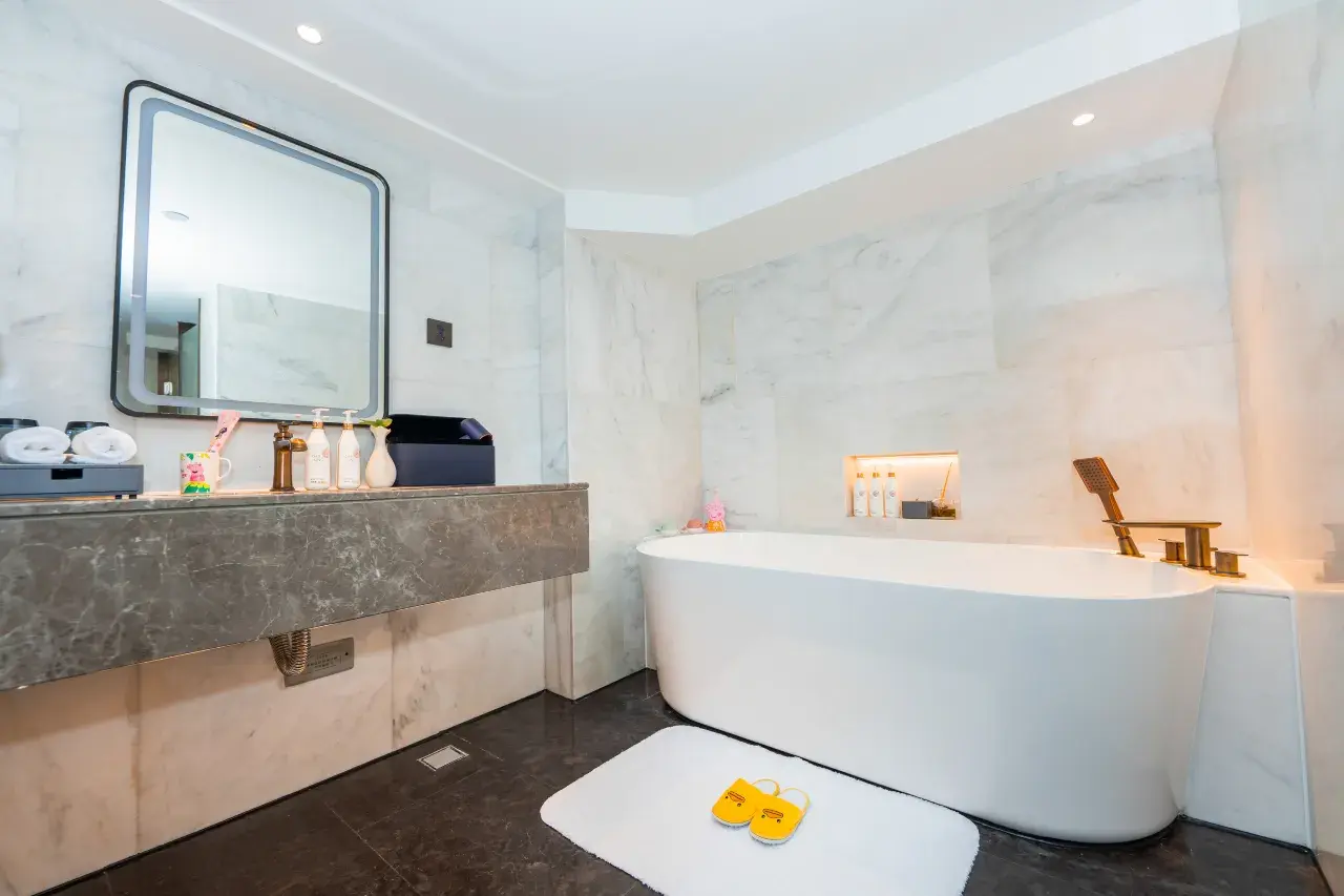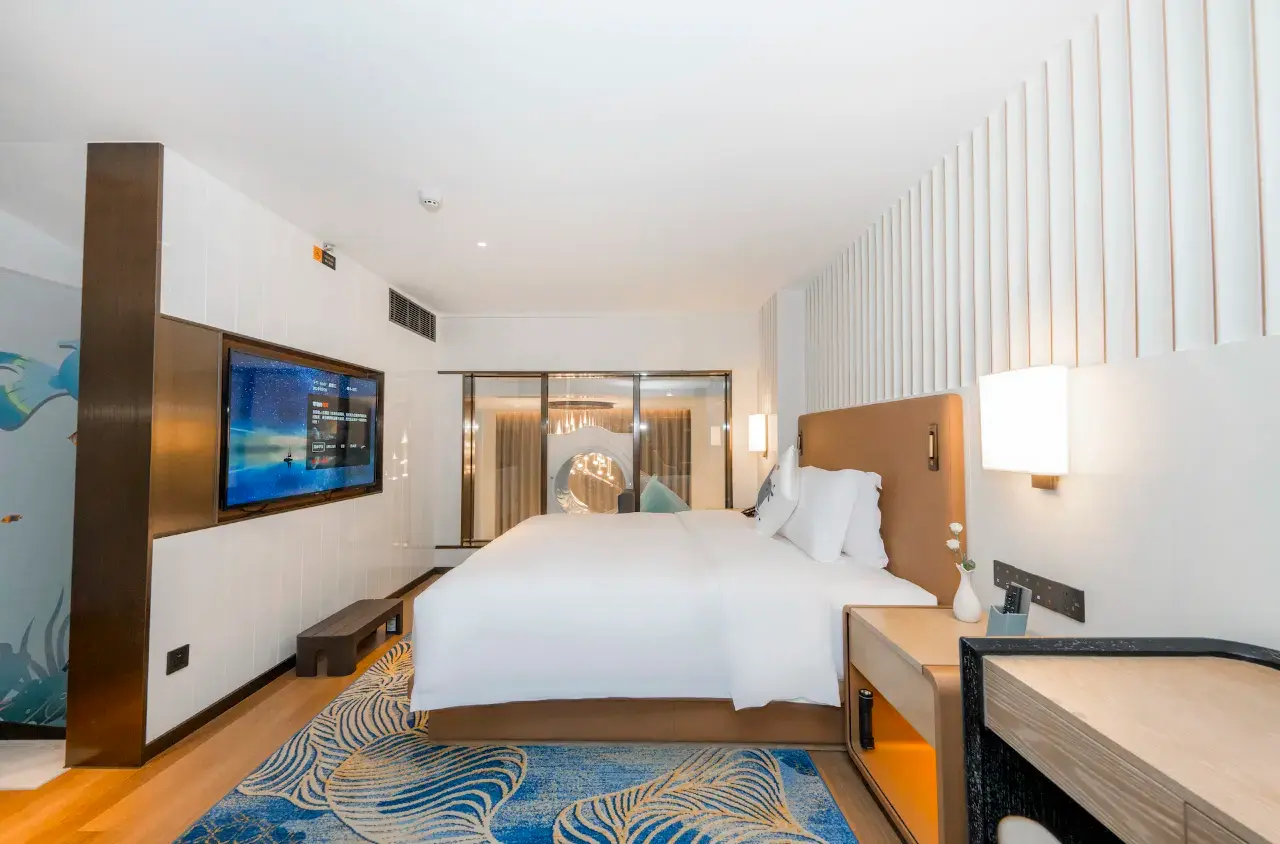 酒店拥有345间客房,房型非常多,湖景房、亲子房主题房、行政房、LOFT房,庭院房等,不同需求的出游人群,都能有满意的选择。本次入住房型的是豪华loft滑梯房,面积75㎡起跳,活动空间很大,布置也是十分童趣。房内配有沙发卧榻、浴缸、鱼子酱吹风机、宝格丽洗浴品(部分房间),床垫是金可儿Kingkoil。