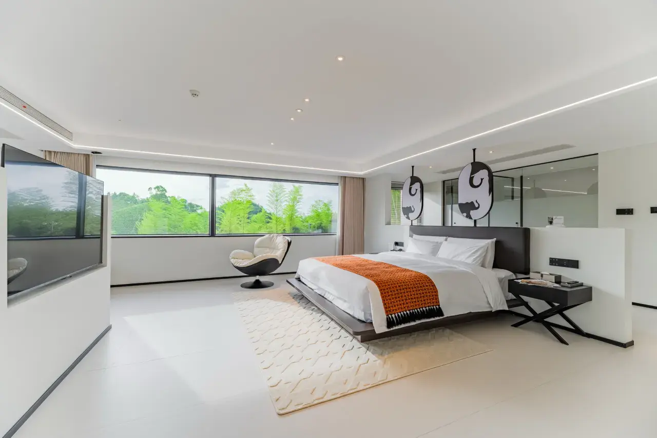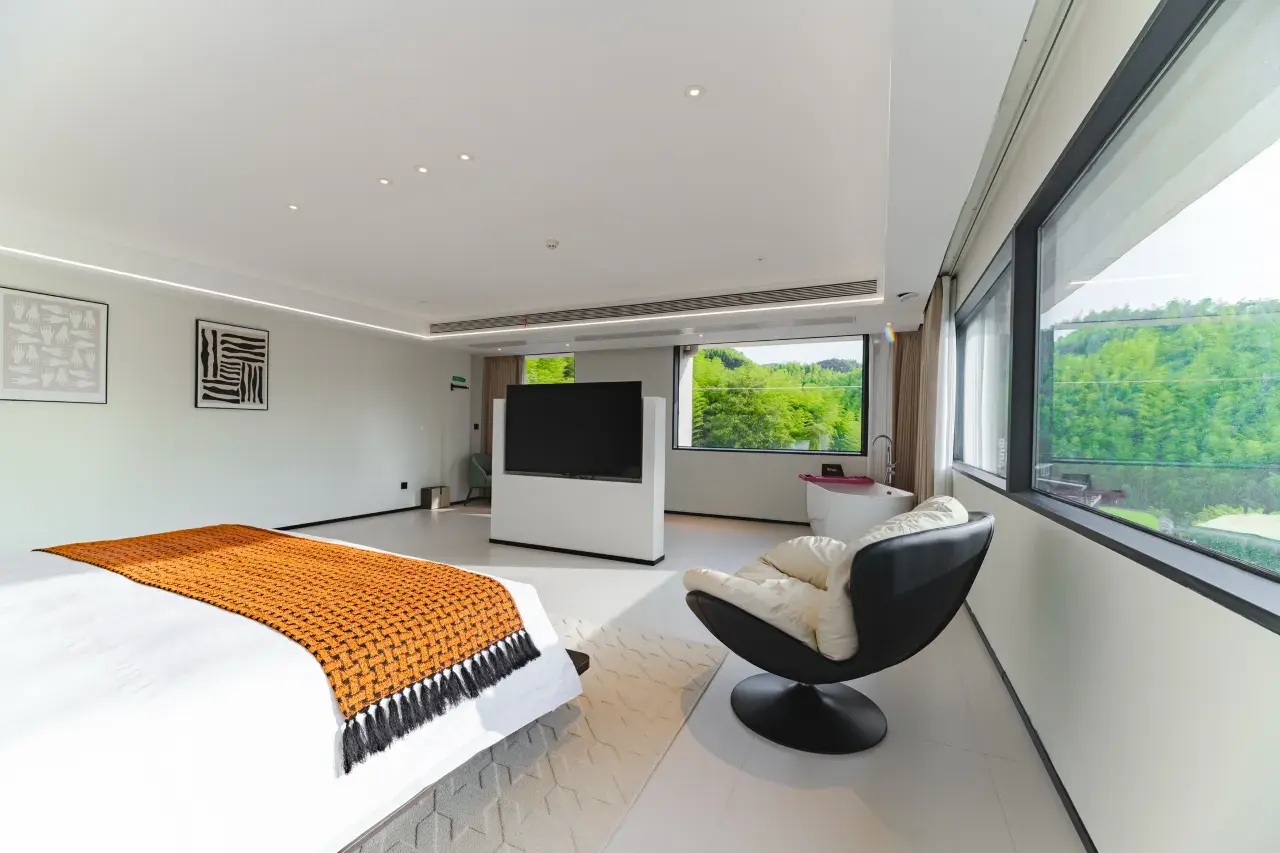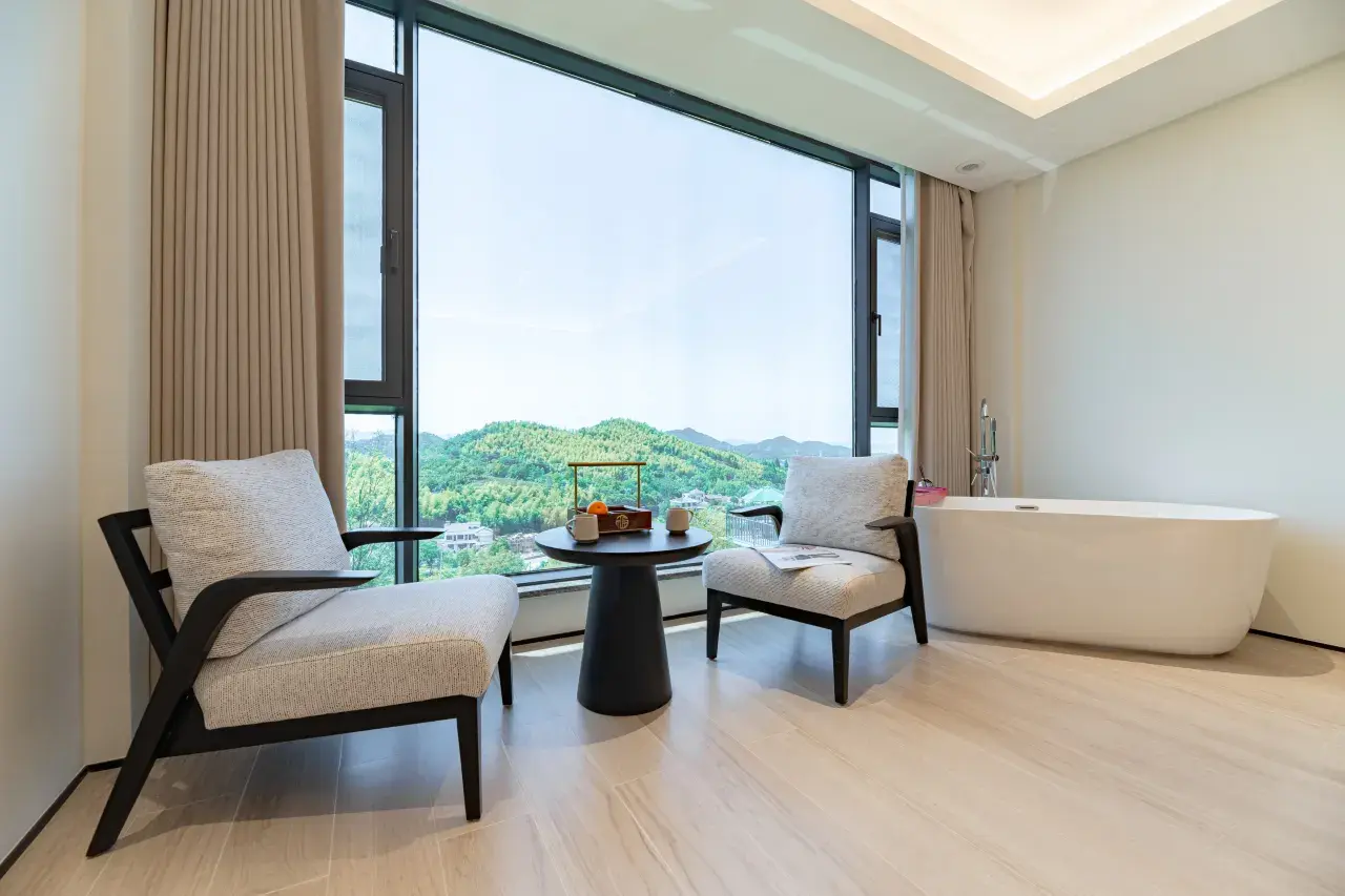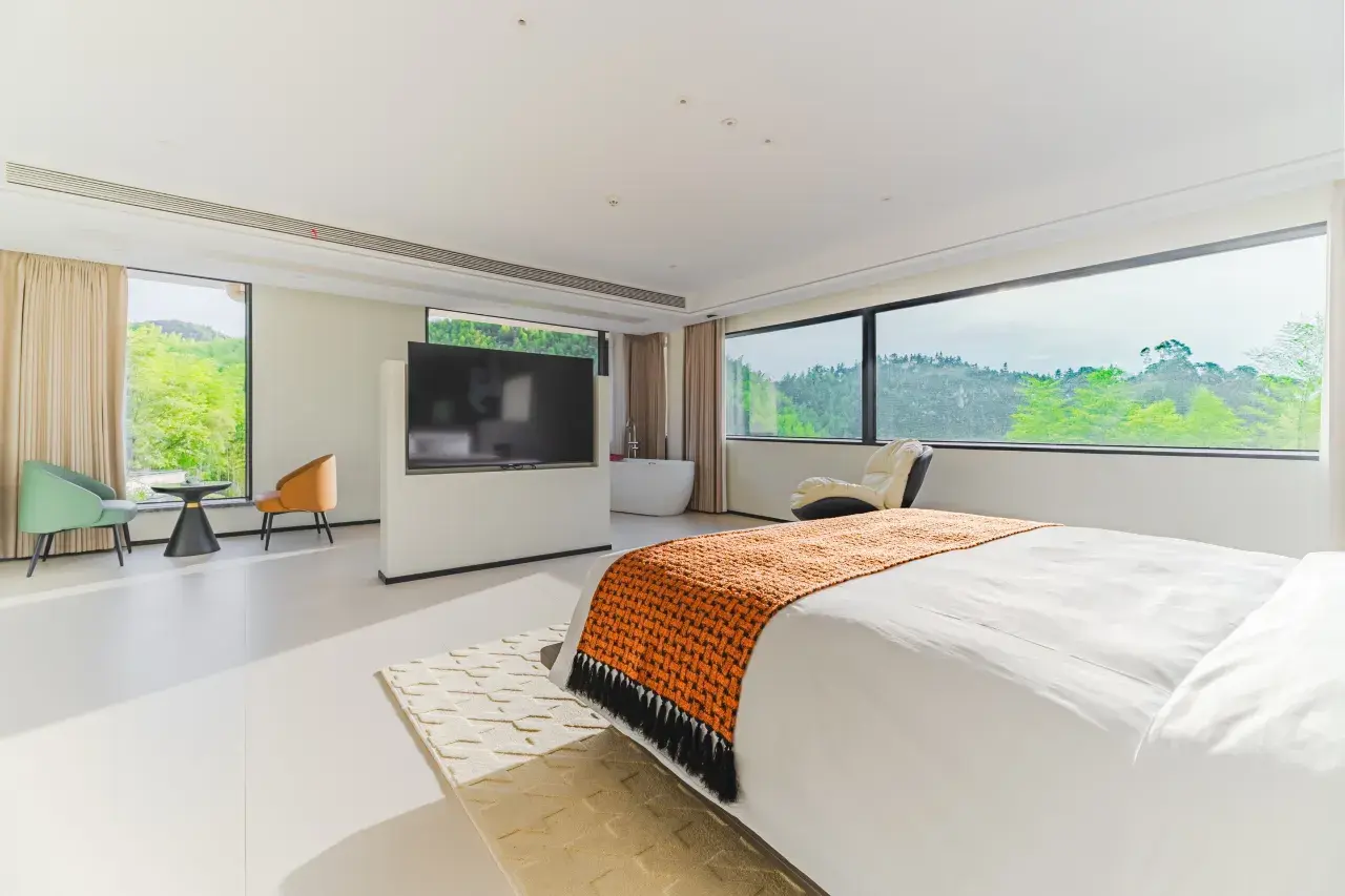 安吉的春天,竹林抽新芽,茶山吐新绿。九翠湾景澜隐于万亩竹海间,听竹大床房枕着簌簌竹声入眠。