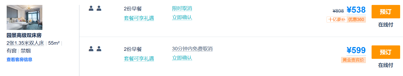 1、高级园景双床/大床房1间1晚