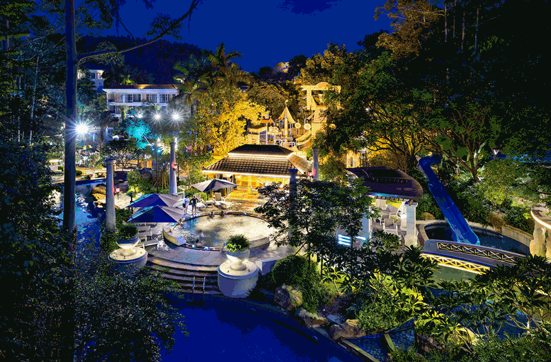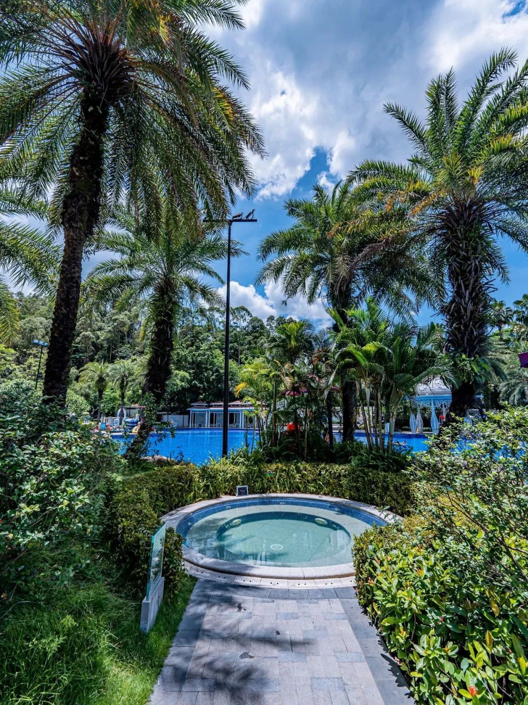 户外温泉按欧洲皇家花园风格设计,分为8区、2 园、38个各具特色的温泉泡池,占地3万多平方米。