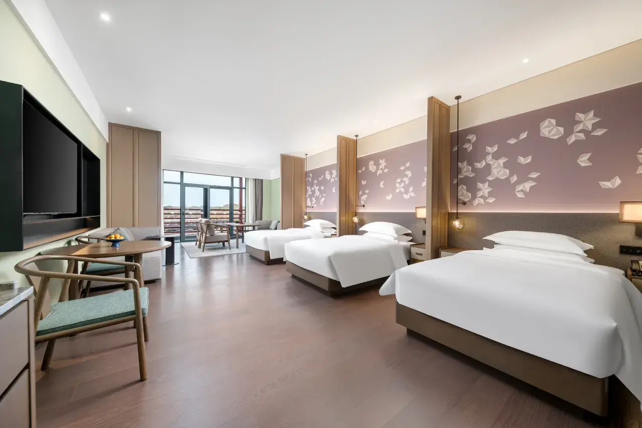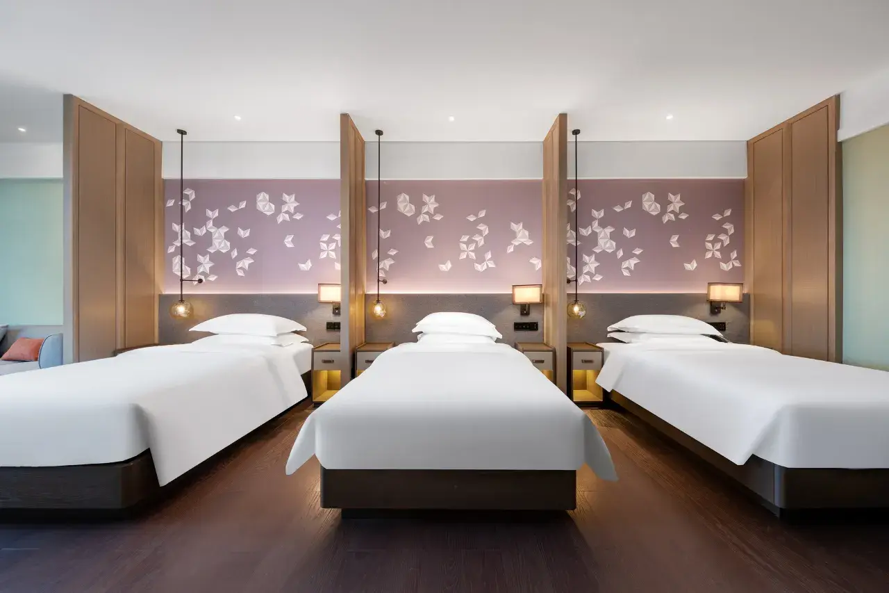 本次套餐入住雅致三人间。面积78㎡起跳,空间宽敞,光线景观无敌。客房设计风格以新中式风情为主,3张1.2米单人床,一家三口也能轻松舒适入住。