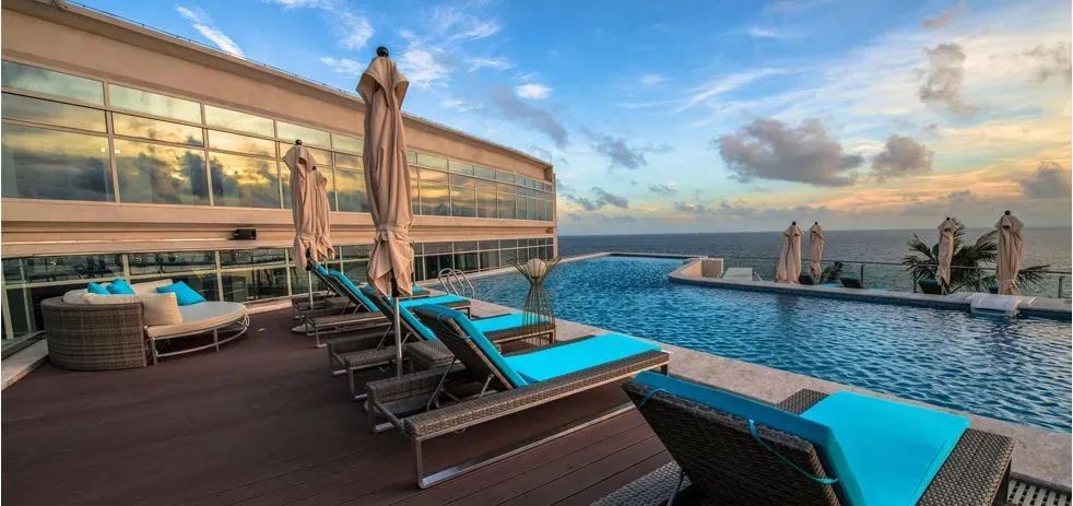 无边泳池位于酒店的一楼,四周是热带风情的树木和花卉,在多个角度望去,蔚蓝的无边泳池和大海真的连接在一起了。这里也是举办池畔派对的时尚之选。