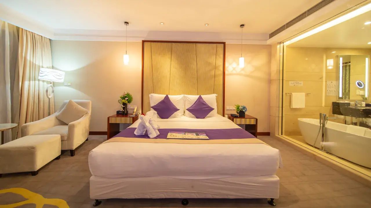 大床房:1张2米特大床,双床房:2张1.4米双人床,53–60平方米