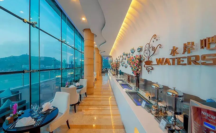 水岸吧西餐厅位于南沙咀主楼5楼,提供中西式自助餐,共有37位坐席,座位都是临窗放置,以全海景用餐布局、营造出美轮美奂的海天盛宴,窗外就是海天一色的海景,置身其中,享受中西式美食,是美食美景的完美体现。