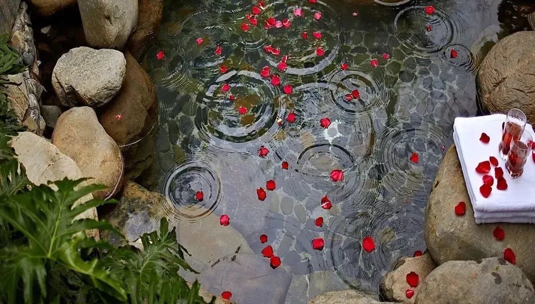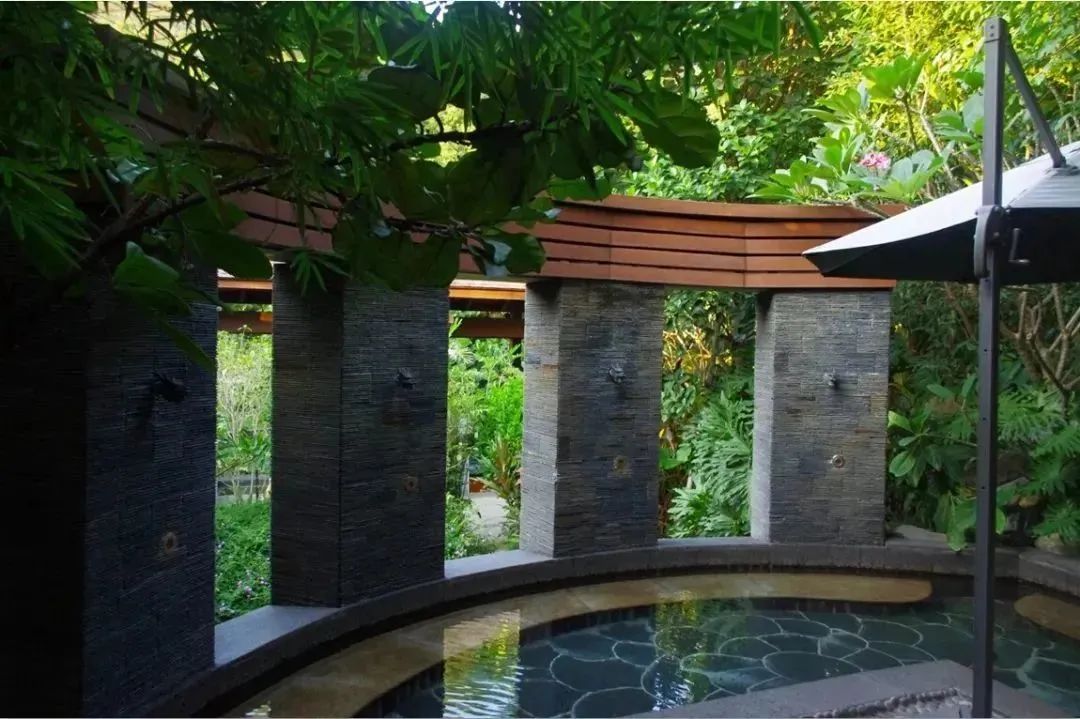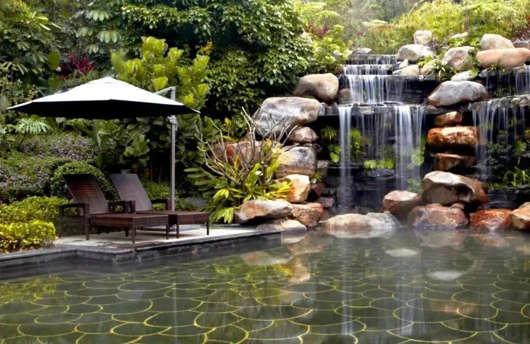 与自然融为一体,瀑布飞流直下,跌入池中。