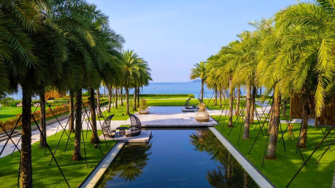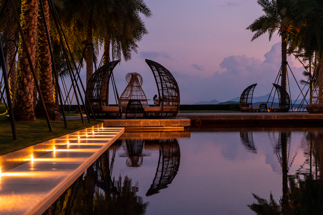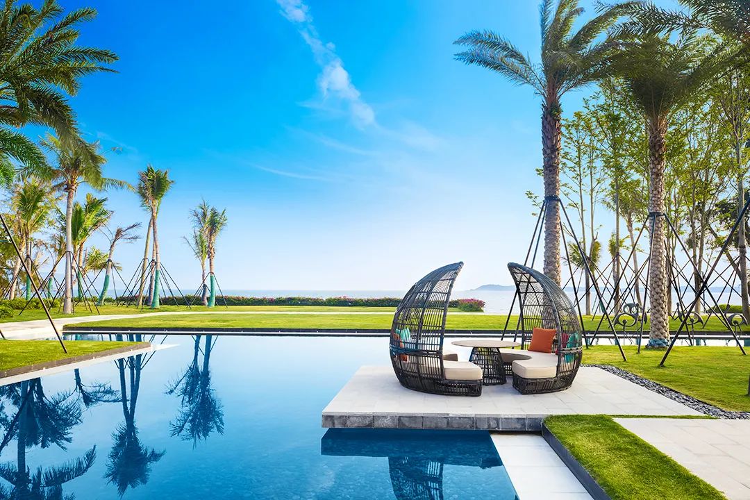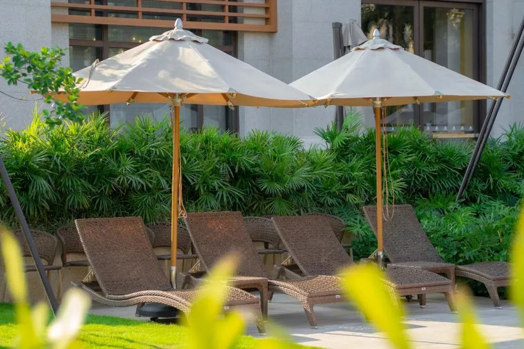 沙滩和主楼之间的户外泳池占地750㎡,水面波光粼粼,在此可以享受来自日光浴床与丛林鸟语带来的纯粹的放松享受。