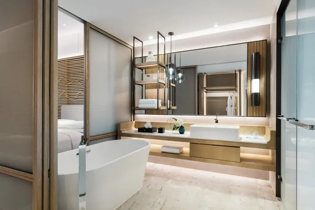 浴室也是同样的风格:原木色、几何线条、简约、宽敞。每个浴室都有大大的浴缸!推开隔断,可以看到外面的景色!