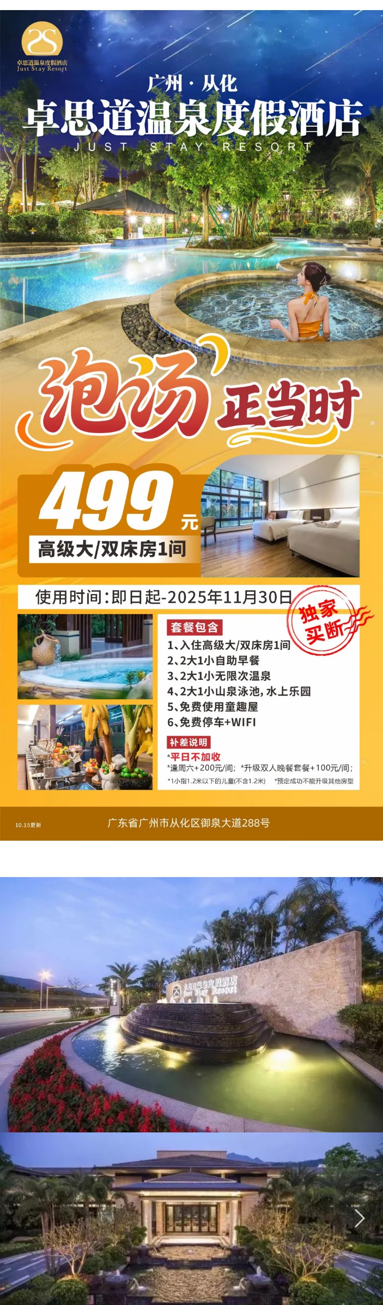 【独家买断】499抢购从化卓思道温泉酒店 、入住高级大/双床房1间+2大1小自助早餐 +2大1小无限次温泉 +2大1小山泉泳池,水上乐园+免费使用童趣屋+免费停车+WIFI+截止到11月30日