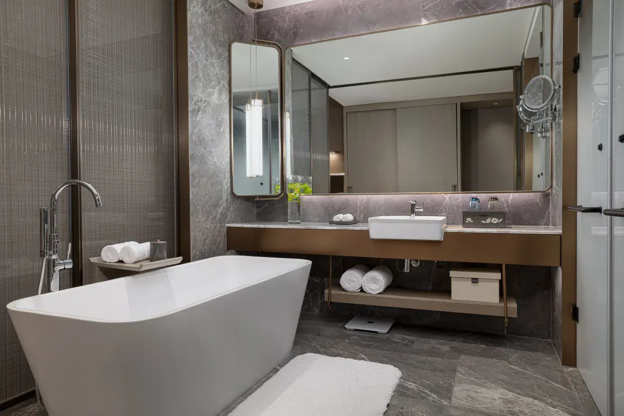酒店设有342间客房,其中包括18间套房,面积40-298㎡不等,分布在2-5层。设计风格撷取现代风格之精华,融入中式传统元素,时尚又不失雅致。宽敞雅致的客房,每间客房设计均撷取现代风格之精华,融入中式传统元素,干净明朗又不失东方神韵,为宾客悉心提供温馨舒适的入住体验,致力让我们每一位顾客能够在高速运转的城市中享受一段舒心的假期。