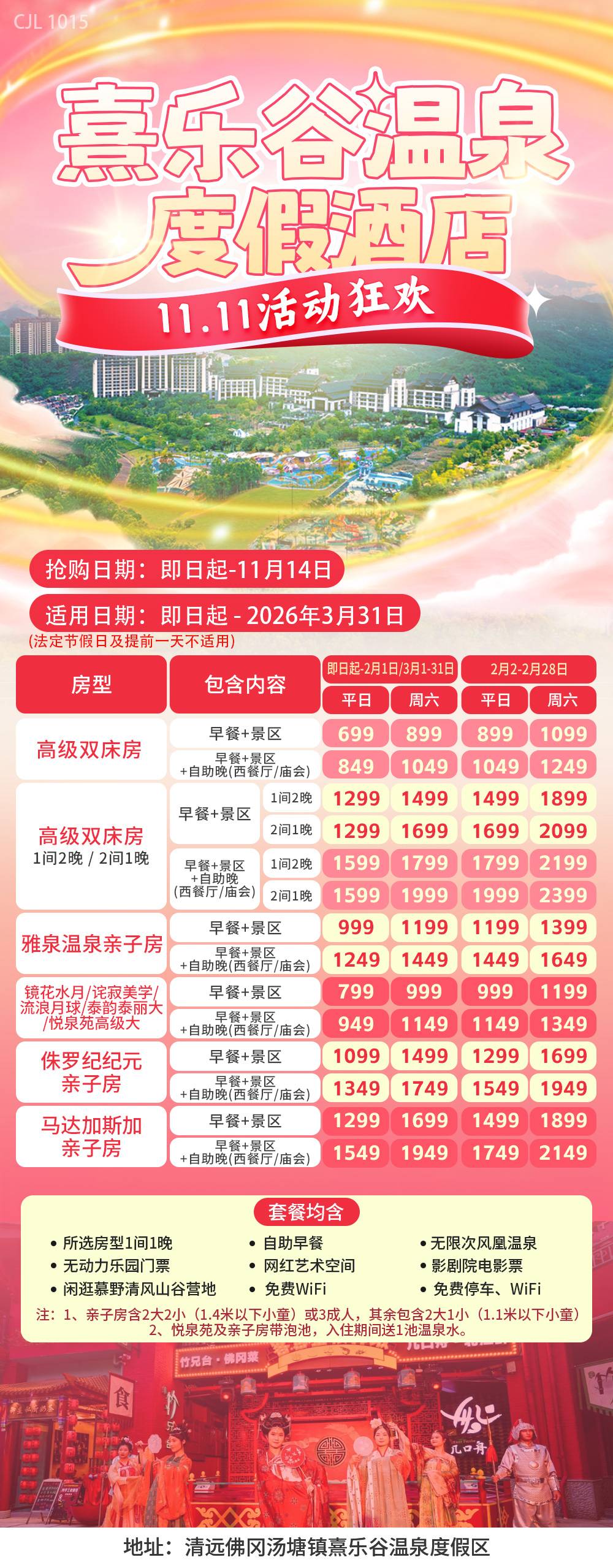 【双十一狂欢】899元起抢金水台温泉小镇复式亲子套房,2大2小自助早餐+自助晚餐+无限次莲花温泉+象窝山生态园门票~ 儿童乐园,健身房等~