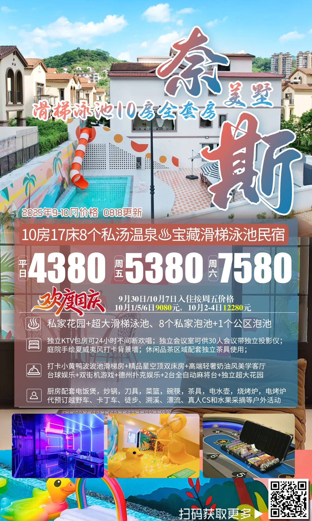 1、奈斯10房17床全套房恒温滑梯泳池别墅住宿1栋1晚