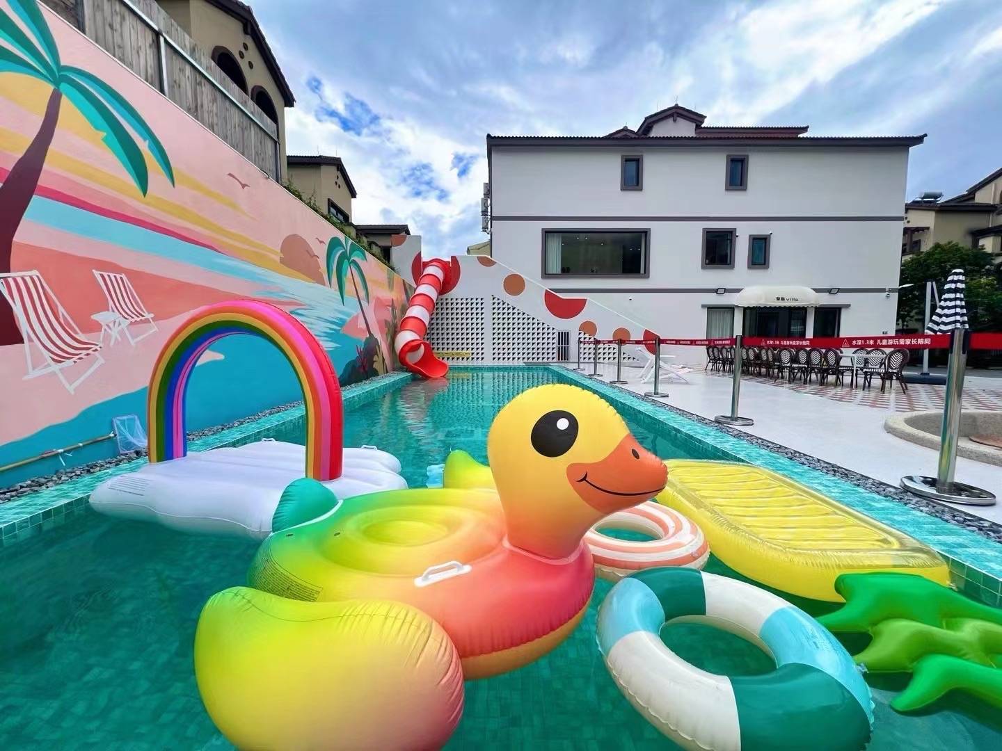 2、私家户外明火烧烤配套、滑梯泳池可开放使用、滑梯波波池小黄鸭主题房、特色主题亲子客房