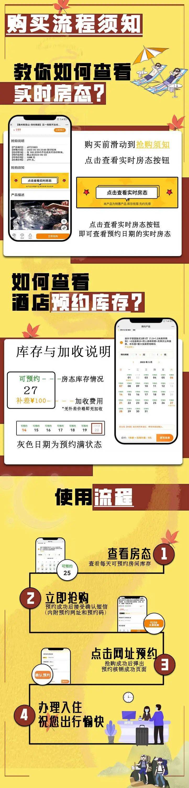 8、每天房间有限,请您务必提前时间预约入住日期,房间先预约先得,预约成功不设退改。为避免下单后因库存不足无法预约,请先查看房态在进行购买