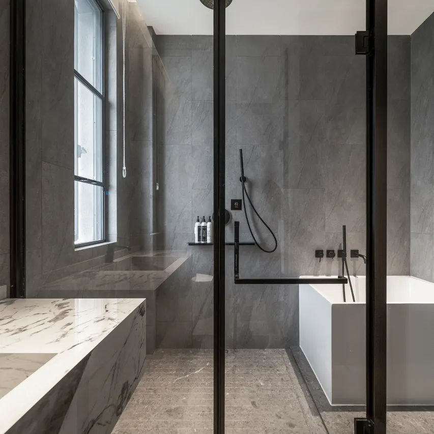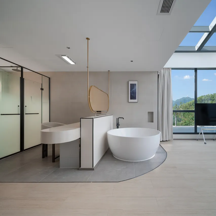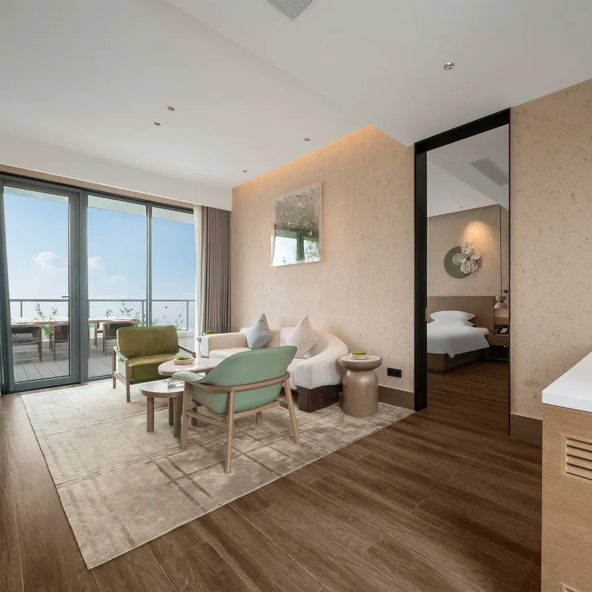 酒店整体建筑风格以岩石灰为主色调,搭配米色、草绿、橄榄棕等自然朴拙色系,将酒店融于自然山水,与山林风云和谐共处。