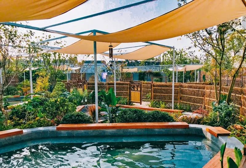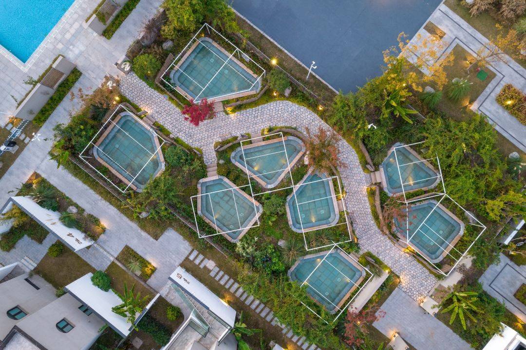 还引入了江南绝佳的天然温泉,8个温泉池散落在花园中,篱笆绿植掩映,颇具海岛风情,来自地下的热泉,四季可泡,大片的草木看得人心情透畅。