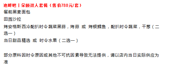②:入住当天池畔吧朵颐午餐或者晚餐套餐(2选1)(12:00-21:00)