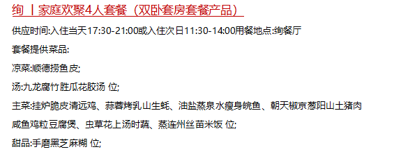 4、以上价格或包含的晚餐套餐使用时间为入住当天晚上17:30-21:00或入住次日中午11:30-14:00二选一,下单需确认使用时间