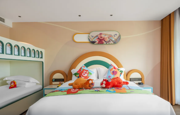 踏入酒店,光头强和熊大熊二已在此等候,瞬间将小朋友带入梦幻般的童话王国。