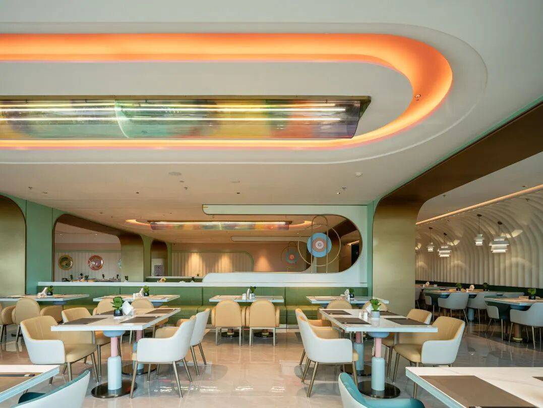 1248㎡的阔绰空间,可同时容纳430余人用餐,餐厅以绿色为主打来设计,仿佛把熊出没的森林搬进了现实