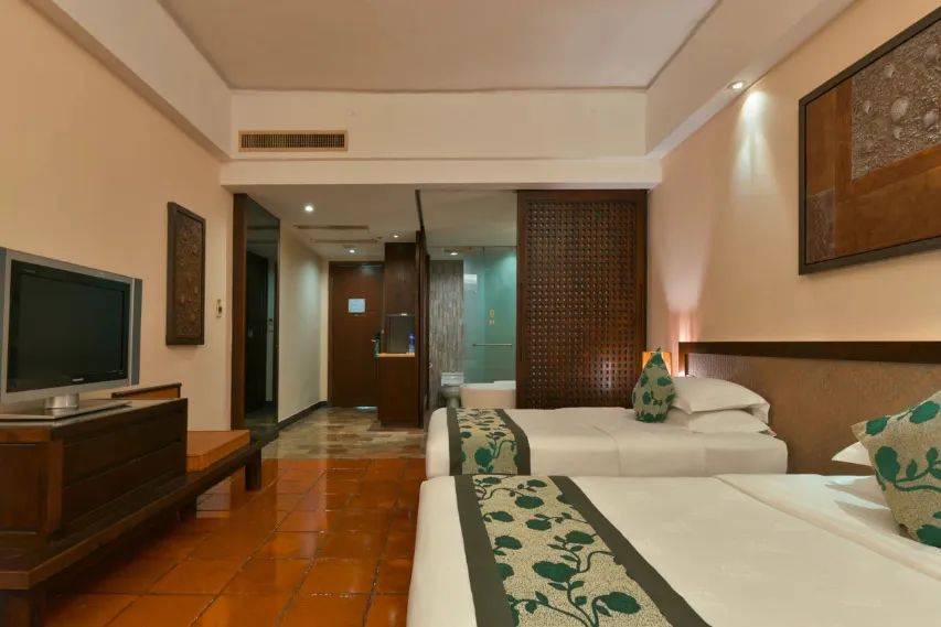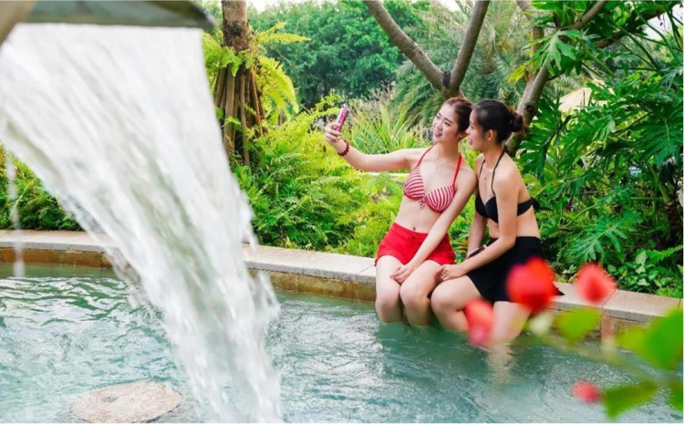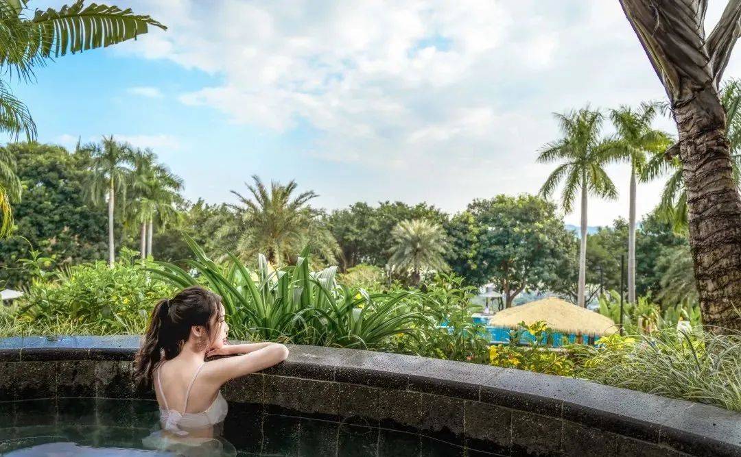 温泉池水质清净,色泽透亮,漫步于椰树丛林中,曲径通幽,感受“东南亚”的热带风情,目之所及皆是绿野仙境。