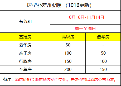 ◆ 2025年10月20日-11月14日、2026年3月:平日不加收、周六+300元/间/晚。