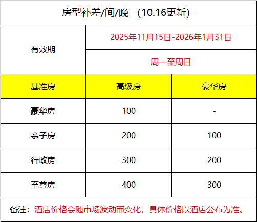 ◆ 2025年12月1日-2026年1月31日:平日+200元/间/晚,周五+300元/间/晚,周六+750元/间/晚。