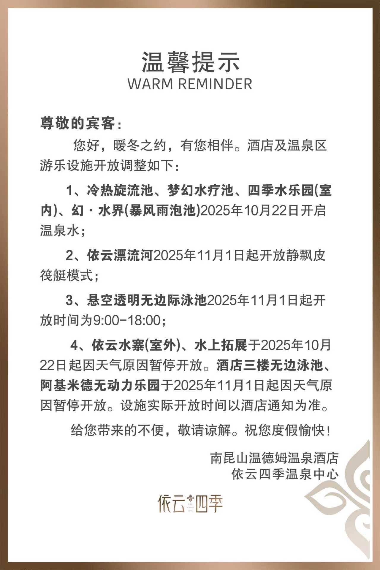 注:1、温泉中心&康体中心如遇维护保养、恶劣天气等,部分设备设施暂停开放,具体开闭时间视酒店而定,设施关闭期间入住/入园,费用不另做退还;