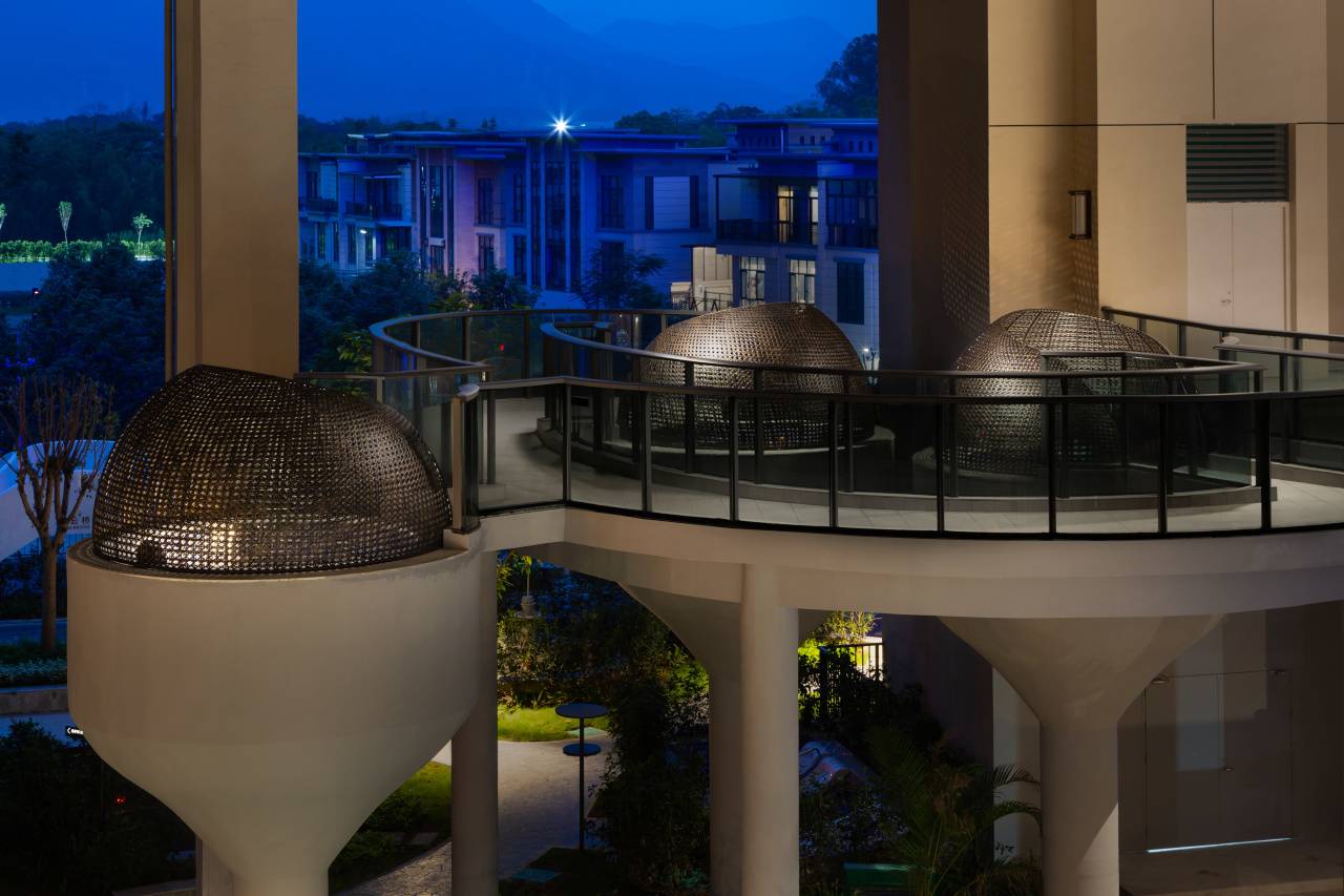 室外温泉区与密林相伴, 主楼架空区半敞开设计,