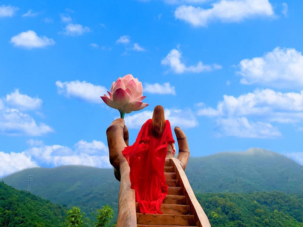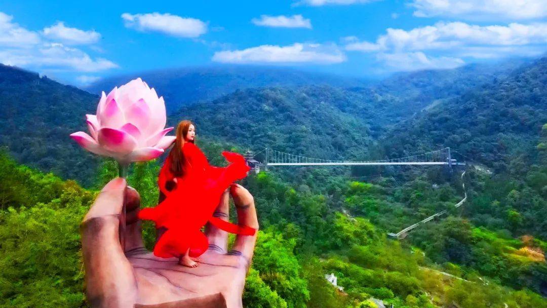 每走一步,脚下的风景就会变化一种美感,走到佛手中心,就能将天露山的层峦叠嶂尽收眼底,阳光洒下,一切显得静谧又悠远,非常壮观。