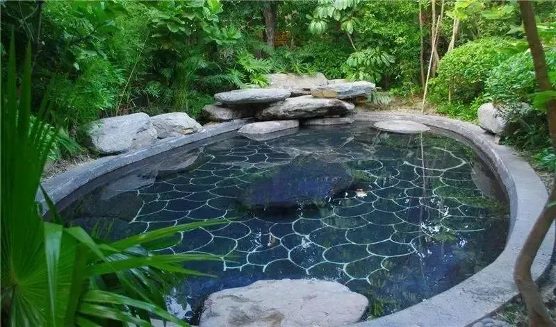 汤状如庭,大石位汤之央,岿然坚毅,不为红尘俗世所动,正如苏东坡“坐看庭前花开花落,笑望天边云卷云舒”娓娓道出淡泊名利,超脱世俗的境界。夏37-38度,冬39-40度。