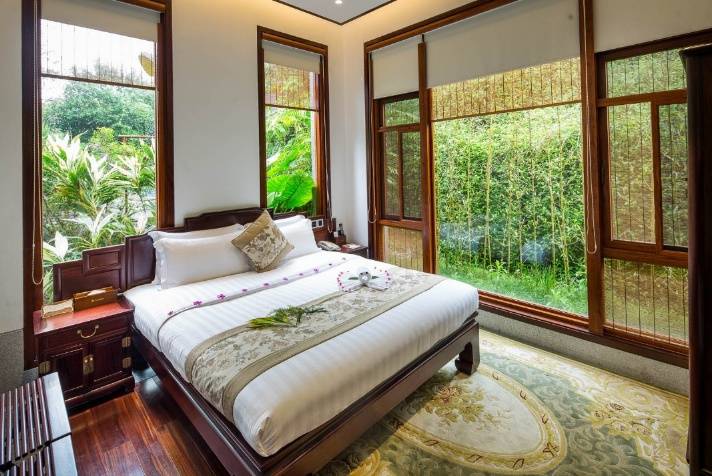 酒店客房由72间主楼客房、18栋各式别墅组成。