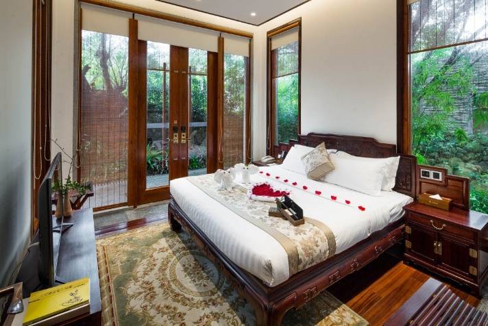 客房内环境幽静、设施齐全且配备全套大红酸枝红木家私。