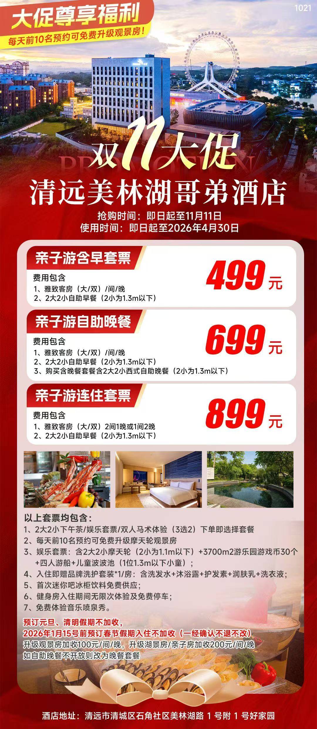 含2大2小早餐+游玩套票,每天限量10间免费升级观景房