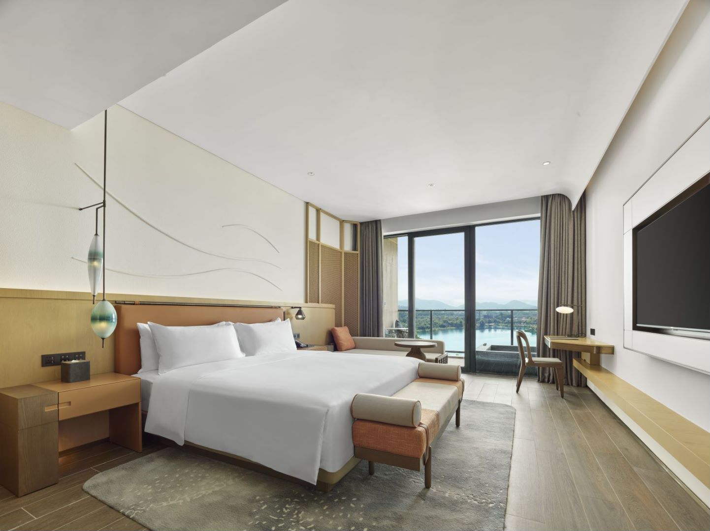 湖光山色的空旷盛景,水天相接,置身其中,宛如浮游于森林氤氲之间,悠然惬意,无拘无束。池畔备有休憩躺椅,客人可以在此稍事休息,欣赏自然