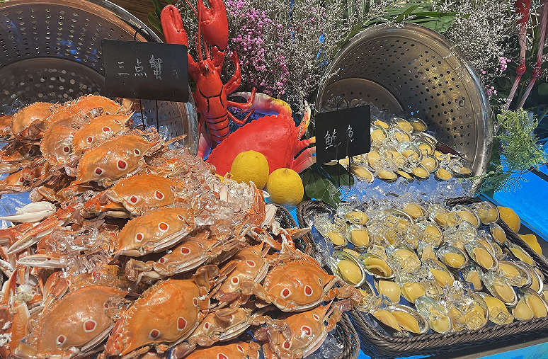 海鲜吧 :罗氏虾 、三点蟹、熟虾、濑尿虾、角螺 、翡翠螺 、