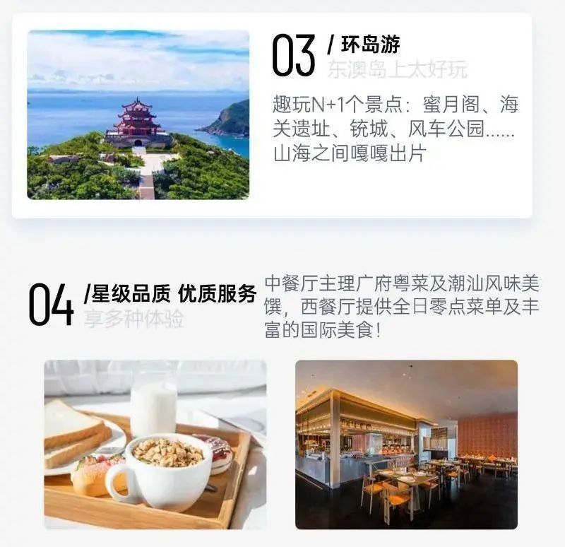 入住在前台出示到东澳岛的船票可兑换每人100元餐饮消费额度,每间房最多可兑换200元。可用于臻厨全日餐厅自助晚餐消费抵扣。如遇自助晚餐不开放,可在万豪中餐厅享消费满400元减200元的优惠活动。消费额度不可兑换现金,不设找零或折现,不可叠加使用,不与其他优惠同享,不适用于团队订房。